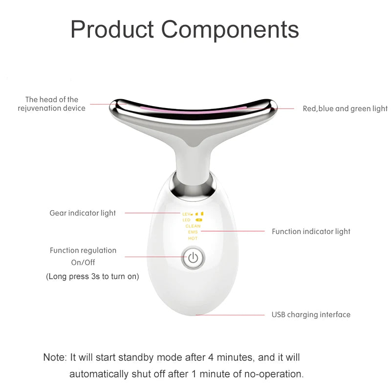 This product can be used to clean the skin, do EMS care and moisturize skin in a warm temperature, which infegrates positive ion, negative ion, high-frequency vibration, red light, blue light and green light.